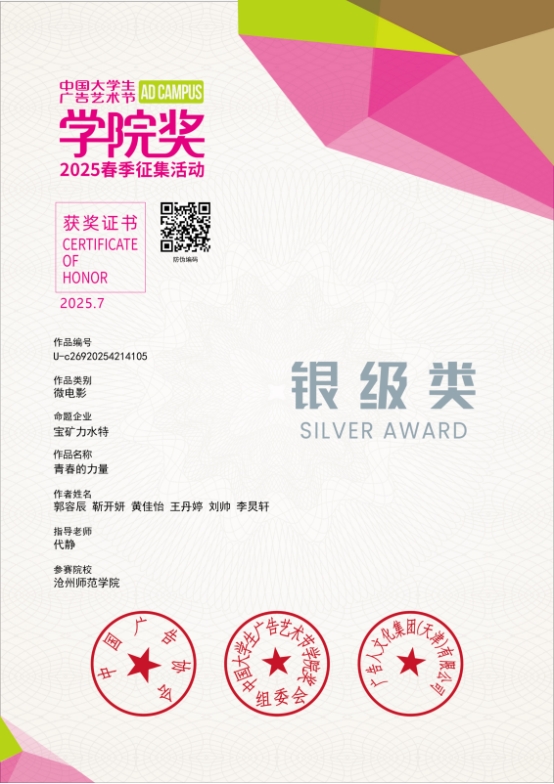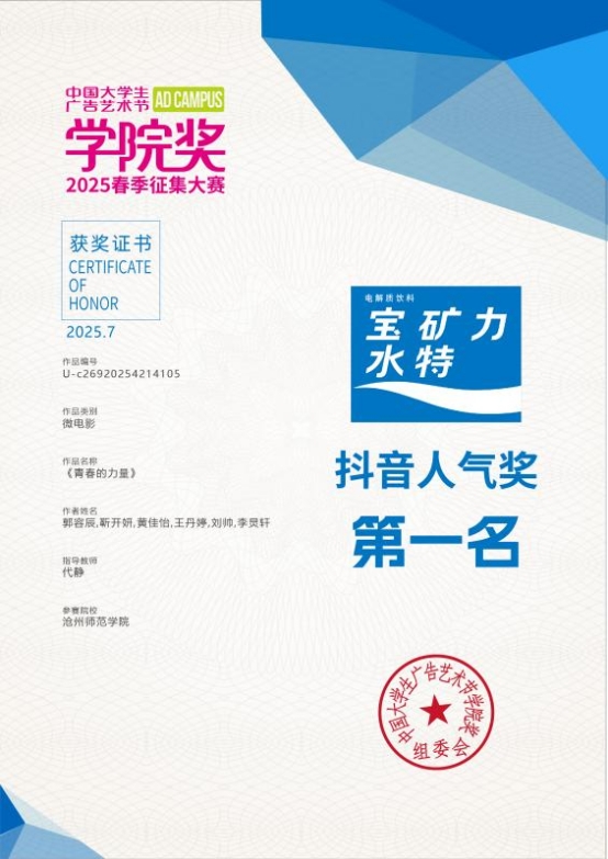 此次大赛中,由代静老师指导,郭容辰、靳开妍、黄佳怡、王丹婷、刘帅、李炅轩等同学共同创作的宝矿力命题微电影作品《青春的力量》获全国银奖。这部作品紧扣宝矿力的品牌理念,以独特的视角和生动的画面展现了青春的活力与激情,将宝矿力所蕴含的能量与青春的力量巧妙融合,凭借出色的创意和精良的制作在众多作品中脱颖而出。同时,该作品还荣获传播赛抖音人气奖全国第一名的好成绩,在抖音平台获得4.8万浏览量。