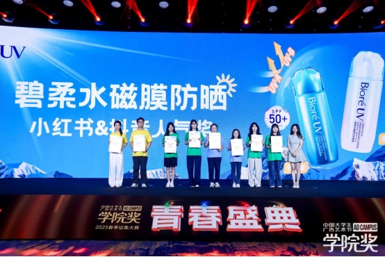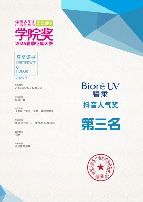 金硕、马佳慧、阮一凡、张思尧、李泽慧5位同学创作的《告别“斑马”色差,硬核防晒》,在碧柔命题影视广告类评选中荣获传播赛——抖音赛道全国第三名。该作品聚焦碧柔的防晒产品,针对 “斑马” 色差这一常见的防晒问题,以新颖的创意和直观的表现形式,突出了碧柔产品硬核的防晒效果,赢得了企业的高度认可。