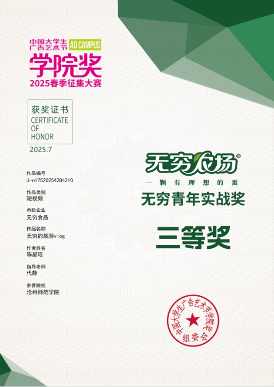 陈星瑶同学创作的《无穷的旅游vlog》获得无穷青年实战奖全国三等奖。