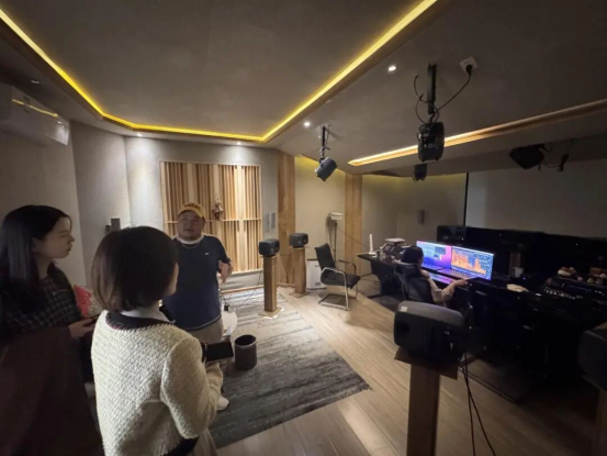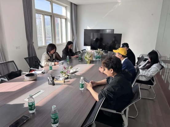 在公司旗下优你娱乐总经理赵龑的陪同下,调研组实地参观公司多功能拍摄棚、后期剪辑与调色工位、声音制作间、置景与道具库、样片放映区等业务板块,详细了解从前期策划、拍摄执行到后期制作、成片交付的流程规范与岗位分工。企业相关负责人介绍项目制管理模式与质量控制标准,展示典型项目的流程节点及人员协同方式,为课程共建提供直观参照。