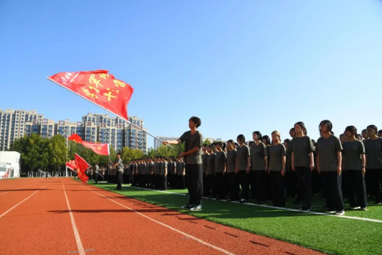 军训汇演在庄严的升旗仪式中拉开序幕。伴随着五星红旗冉冉升起,全体人员肃立,共唱国歌,行注目礼,表达对祖国深切的热爱与敬重之情。